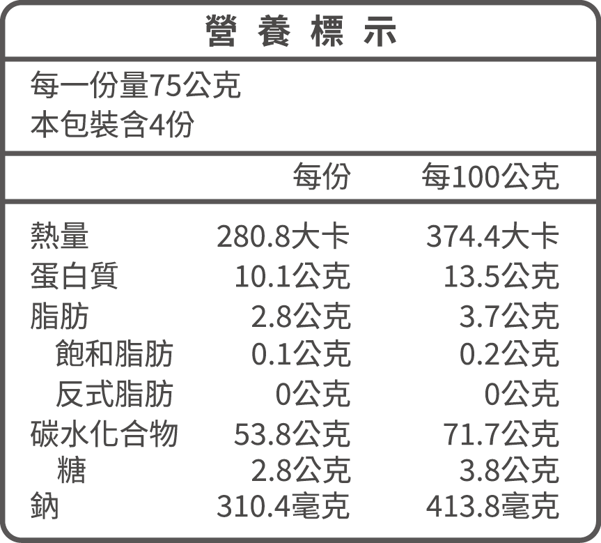 麵條成份:美國小麥粉、水、精鹽、專利菇蕈萃取物【靈芝菌絲體粉 (Ganoderma lucidum (Leyss. : Fr.) Karst.,液態培養)、玉米來源可溶性纖維】